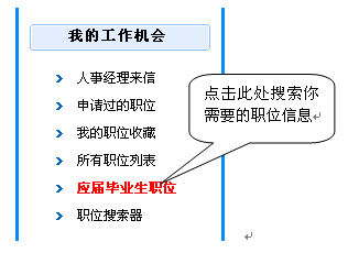 注意:如果你是應屆畢業生可以進入"個人管理中心",位于左側子欄目的"我的工作機會",點擊"應屆畢業生職位"如下圖所示: